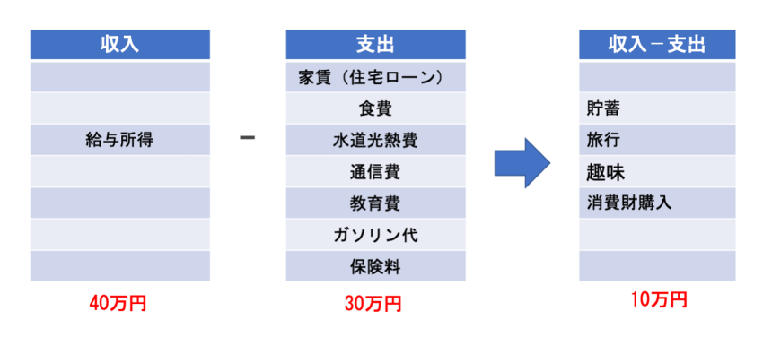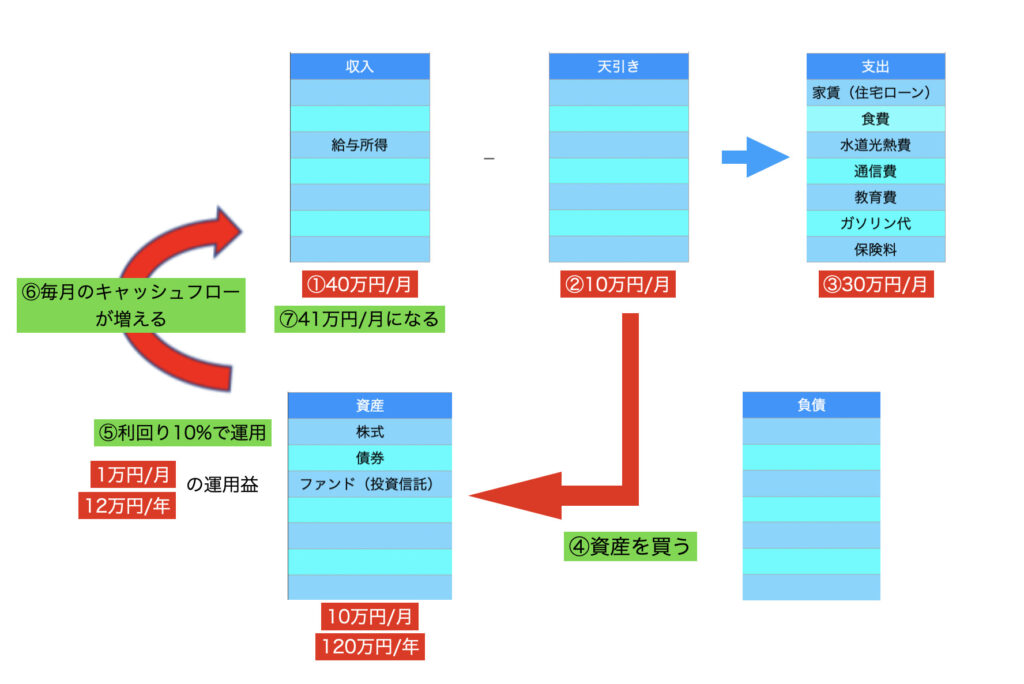 「まずは資産を買え」「お金を使う順番を変える」の記事において、「収入」「支出」、「資産」「負債」といった項目を利用して、お金を使う順番について説明しました。