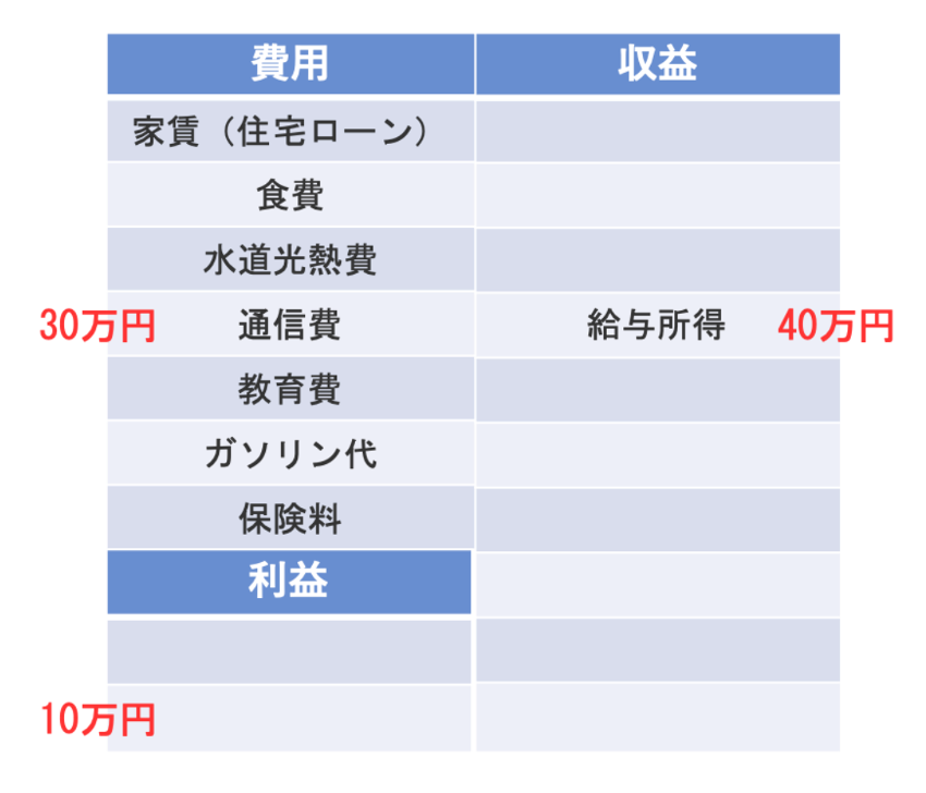 「収益」から「費用」を引いた「利益」はいくらかを表しており、「収入ー「支出」=「収入-支出」の図とは項目が左右逆となりますが、「収益−費用=利益」ということには変わりないです。