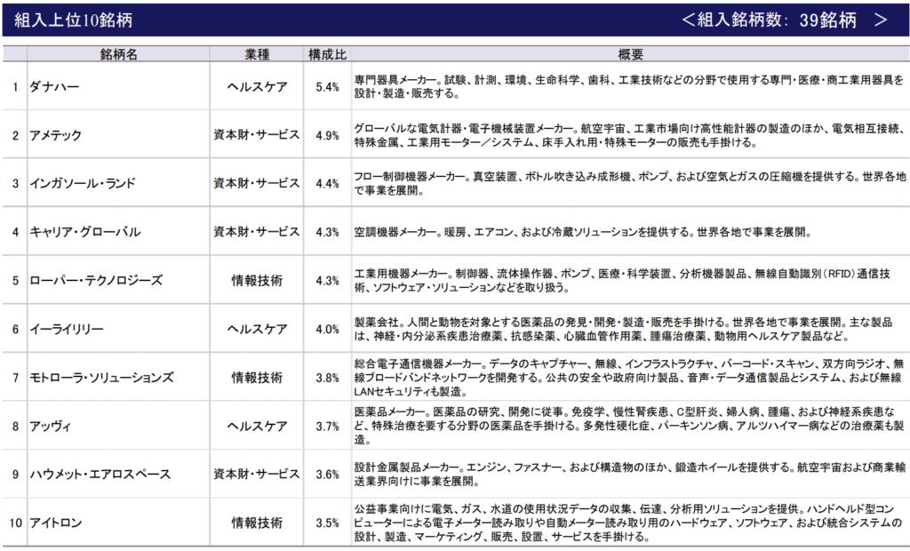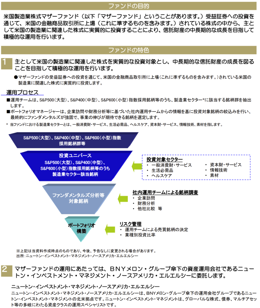 米国S&P指数採用銘柄から製造業セクターで銘柄絞り込みを実施し、ファンダメンタルズが強固で、事業の伸びが期待できる銘柄を選定して投資するようです。BNYメロンは信託業務に強みがある米国大手の金融機関です。資料にもあるように傘下のニュートン・インベストメント・マネジメントに運用委託しています。