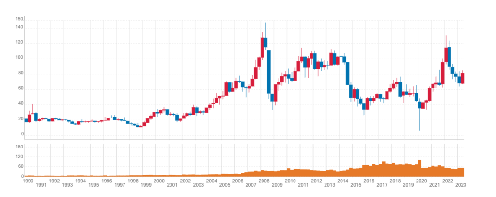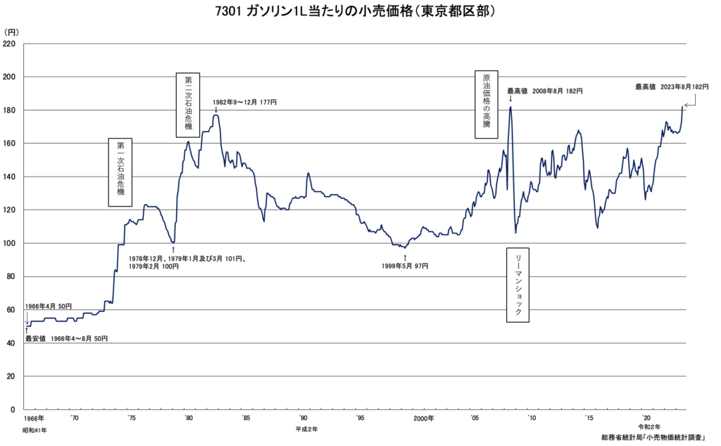 上図は1966年4月〜2023年8月までのガソリン価格(東京都)の推移です。1966年は50円という今では考えられない価格です。第一次、第二次オイルショックで177円と大きく上昇しますが、逆オイルショックで価格は下がります。サブプライムローン問題の影響で、2008年に再び高騰して過去最高値の182円をつけますが、リーマンショックで急落。再度上昇しますが、米国が原油輸出を解禁したことが原因で2016年3月には109円まで落ち込んでいます。その後も上昇しますが、コロナショックにより世界経済が停滞しガソリンの消費が減少したことも影響して下落。そして2022年からロシアのウクライナ侵攻により原料の原油価格が上昇の影響で現在182円となっています。