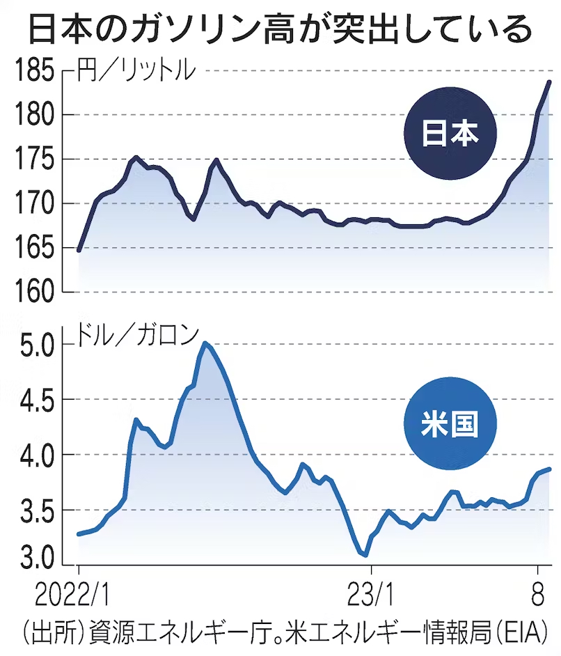 上図の通り、米欧先進国はガソリンの高騰局面から脱している。米エネルギー情報局(EIA)によると、28日時点での米レギュラーガソリン小売価格は1ガロン3.8ドル台前半となり、22年6月に付けた高値に比べて24%安いです。ドイツやイタリアなど欧州の小売価格も昨年のピークを下回っています。