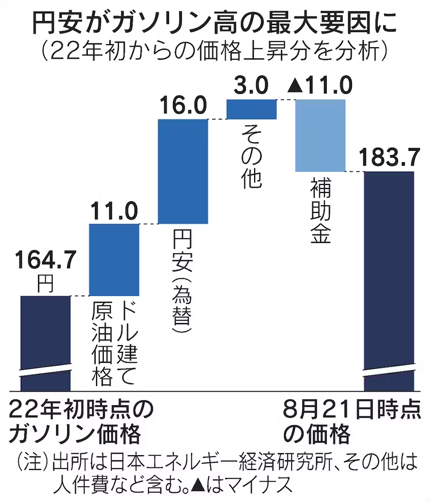日本のガソリン高が突出している背景には為替の円安があります。原油を輸入に頼る日本では円安の進行がガソリン価格の押し上げにつながります。日本エネルギー経済研究所の柳沢明研究主幹の試算によると、補助金の影響を加味した22年初からのガソリン価格の上げ幅(1リットル19円)のうち、為替の円安が押し上げに影響したのは16円分となっています。ドル建て原油価格による押し上げ分の11円を上回り、全体への寄与率は84%に達しました。柳沢氏は「22年に急速に進んだ円安が価格の押し上げに大きく響いた」と指摘しています。