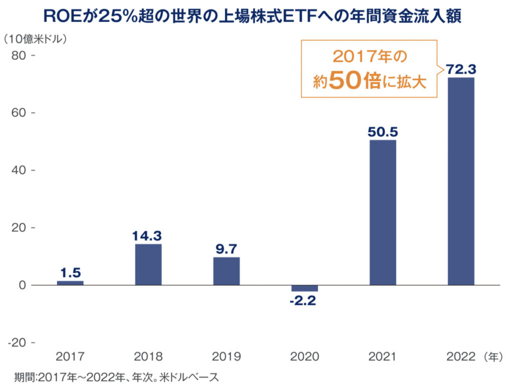 高いROEというのは25%以上の企業を言います。そうした企業の株への資金流入がここ2年で突出してくるようになってきました。