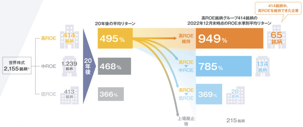 高いROEを長年維持するというのは大変なことのようで、20年でこれだけの企業が脱落しています。元々414銘柄合った高ROE企業も20年間でたった65銘柄になってしまってます。