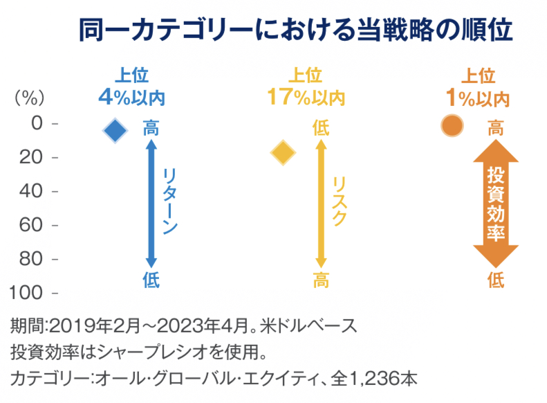 同一カテゴリ(世界株)におけるパフォーマンスはリターン、リスク、投資効率(シャープレシオ)、いずれにおいても上位に入っており、このファンド会社の優秀さを表しています。