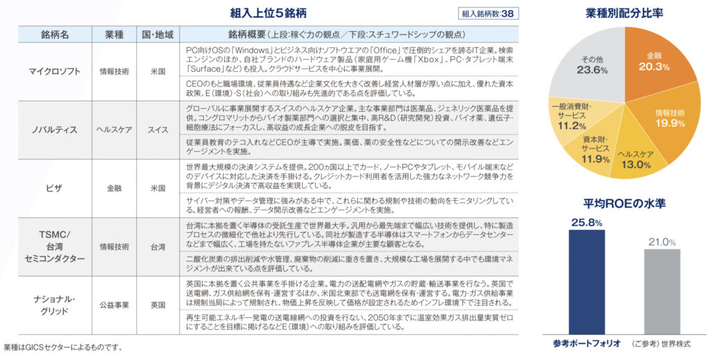 またセクターごとに見ると、意外にも金融が最も多く、ヘルスケア、資本材・サービスなどの比重も高いことから、本当に企業ごとにその業界で高ROEな企業を選んでいるようです。