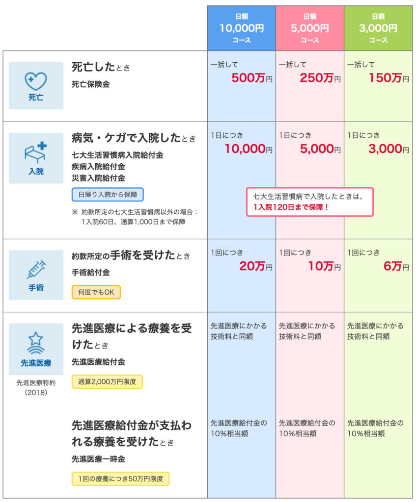 死亡保障付の医療保険で、死亡保障と医療保障はどちらも一生涯の保障です。保障プランは3つ(1万円、5千円、3千円)から、払込期間は3種類(60歳、65歳、終身)から選択できます。一生涯の死亡保障ということで、終身保険がくっついてると思いますが、この保険には解約返戻金が増えていく機能はありません。その分、割安な保険料で一生涯の死亡保障と医療保障を備えることができる仕組みになっています。