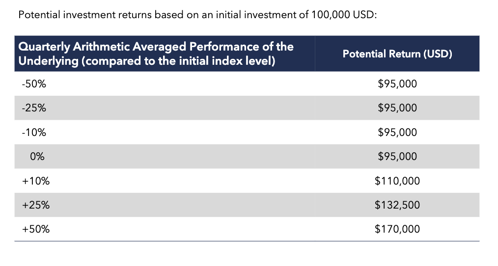 逆に言えば、ヘッジファンドの四半期平均パフォーマンスがマイナスになったとしても満期時には元本の95%が返ってきますので安心ですね。