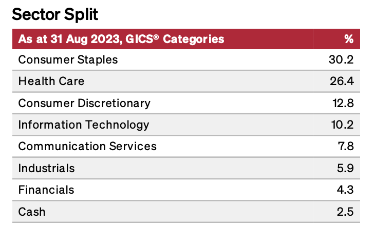 2023年8月31日時点での保有銘柄数は27ですが、そのうちTop10銘柄は以下の通りです。