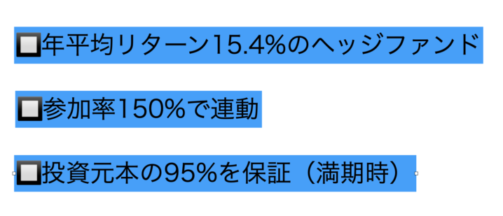 - 年平均リターン15.4%のヘッジファンドに参加率150%で連動する