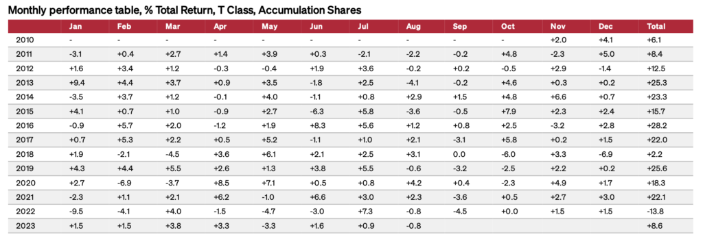 2010年の運用開始からの年間リターンではマイナス運用になったことは1回のみ、年平均リターンは15.4%と驚異的な数字を叩き出しております。