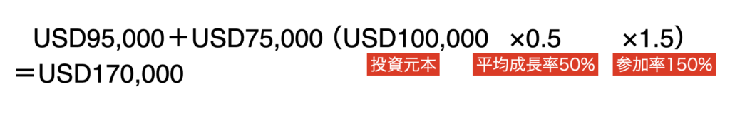 例えば、ヘッジファンドのパフォーマンスが平均成長率+50%だった場合、投資元本の95%(USD95,000)に加えてUSD85,000がリターンとして返ってきて、トータルリターンはUSD170,000 になるということですね。