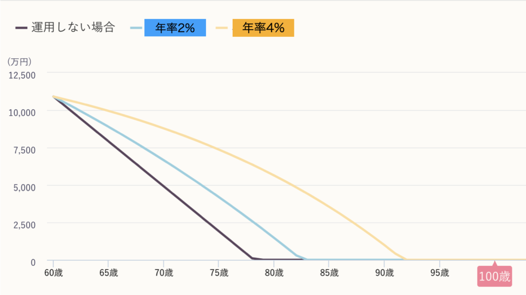 そのクライアントの場合、その後、実質利回り2%(年平均4%の利回り – 毎年2%の物価上昇)で運用しながら、生活費として毎月50万円ずつ取り崩した場合、受け取り期間は22年7ヶ月となりました。