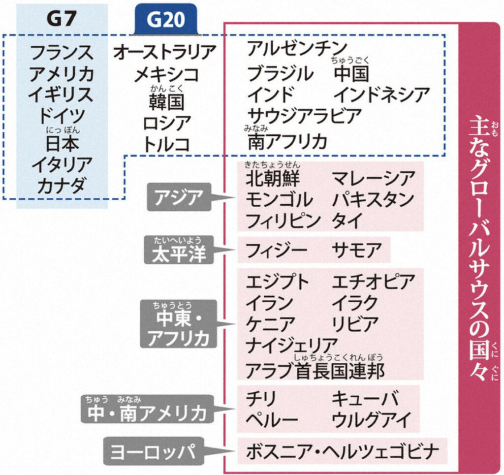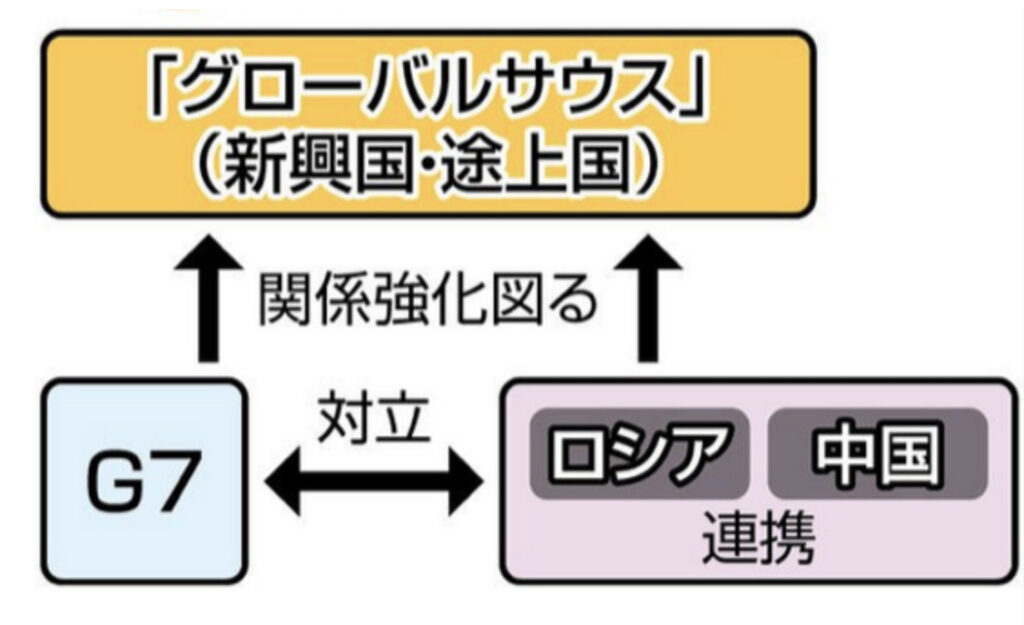 いまや世界は西側諸国(G7)、ロシアや中国、そしてグローバルサウス(この場合、中国は含まず)の3グループに分かれてしまい、西側諸国(G7)とロシア・中国が「グローバルサウス」との関係強化を図っているという状況というのは覚えておいてください。