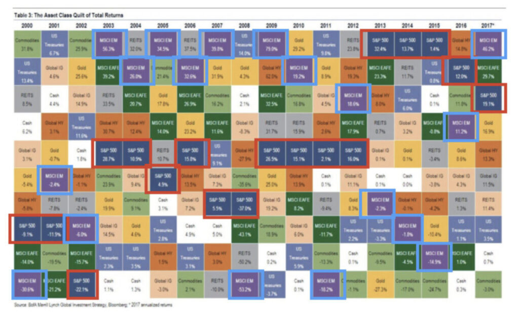 ここ10年はS&P500(米国株)は調子が良かったですが、2000年代はMSCI EM(新興国)がS&P500(米国株)を凌駕してました。