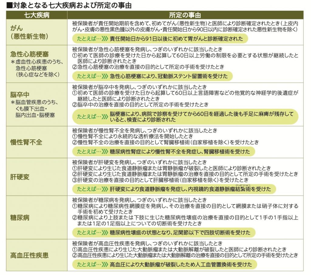 商品の特徴としましては、所定の7大疾病・就労不能状態・要介護状態・高度障害状態に一時金として保障される保険です。