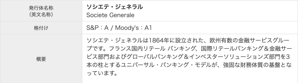 なお、ソシエテ・ジェネラルは、フランスでBNPパリバに続くメガバンクであり、S&Pから「A」、Moody’sからは「A1」の格付けを獲得しております。