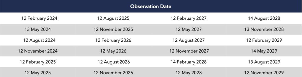 ・固定期間終了時には、上限なしのS&P500インデックス成長率の150%が投資資金に充当されます。最終的な成長率の計算は、固定期間の全6年間にわたる四半期ごとの算術平均を採用しており、合計24回の平均日があります。