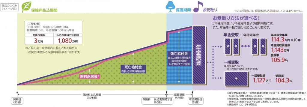 保険料を20〜40年の範囲で支払い、0〜5年の範囲で寝かせて、定額年金として5年間か10年間で受け取っていく保険商品です。これと言って特徴はなく、払込期間、据置期間、年金受取方法の選択肢が少ないです。もちろん、利率はめちゃくちゃ低いです。