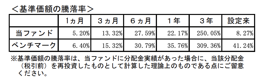 この3年間のパフォーマンスは、<トータルリターン指数>で見ていただいた通り、米国株に対してかなりアウトパフォームしておりましたが、設定来の年率リターンを見ると8.27%ですから、まずますといったところでしょうか。