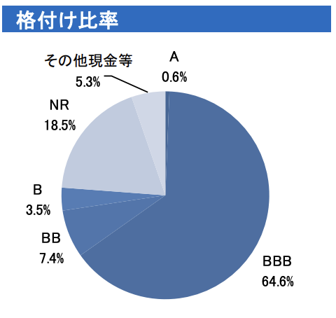2023年9月末時点では、平均格付けはBBB-となっており、格付け比率は下図の通りです。なお、BBB以上の格付けの債券が「投資適格債」と考えられおります。