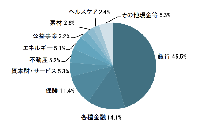 2023年9月末時点で84銘柄に投資されており、そのうち上位10銘柄とセクターはそれぞれ以下のようになっております。金融セクターへの投資が多いですね。