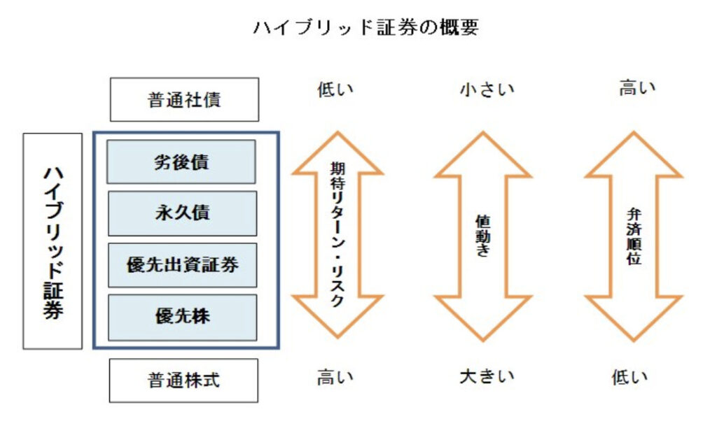 「ハイブリッド証券」とは、株式と債券の両方の性格を併せ持った証券のことで、劣後債や永久債、優先出資証券、優先株などがそれに当てはまります。