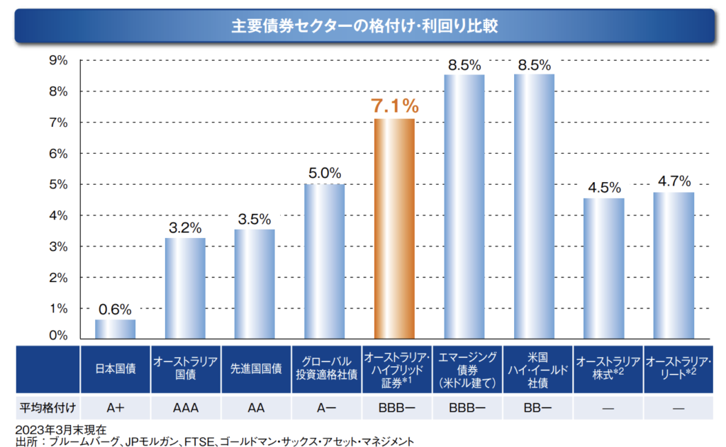 以下は2023年3月末時点において他の債券利回りと比較した資料ですが、他の投資適格債に比べると利回りは高いですね。