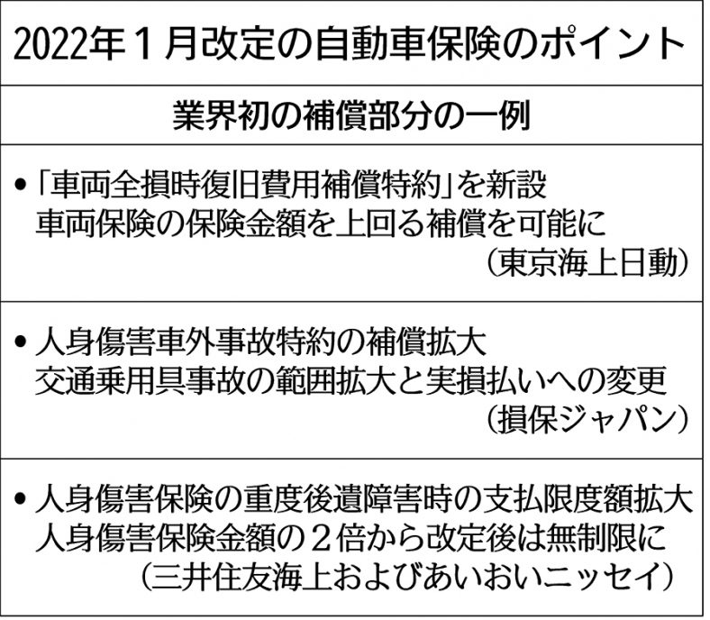そんな中、損害保険大手4社は自動車保険の2022年1月改定に合わせて業界初の補償を投入する。22年1月改定では任意加入の自動車保険料が平均1~2%程度引き下げられる見通しで、保険契約者にとって分かりやすく恩恵が及びうる新たな補償を提案する。主な改定のポイントは下記となります。