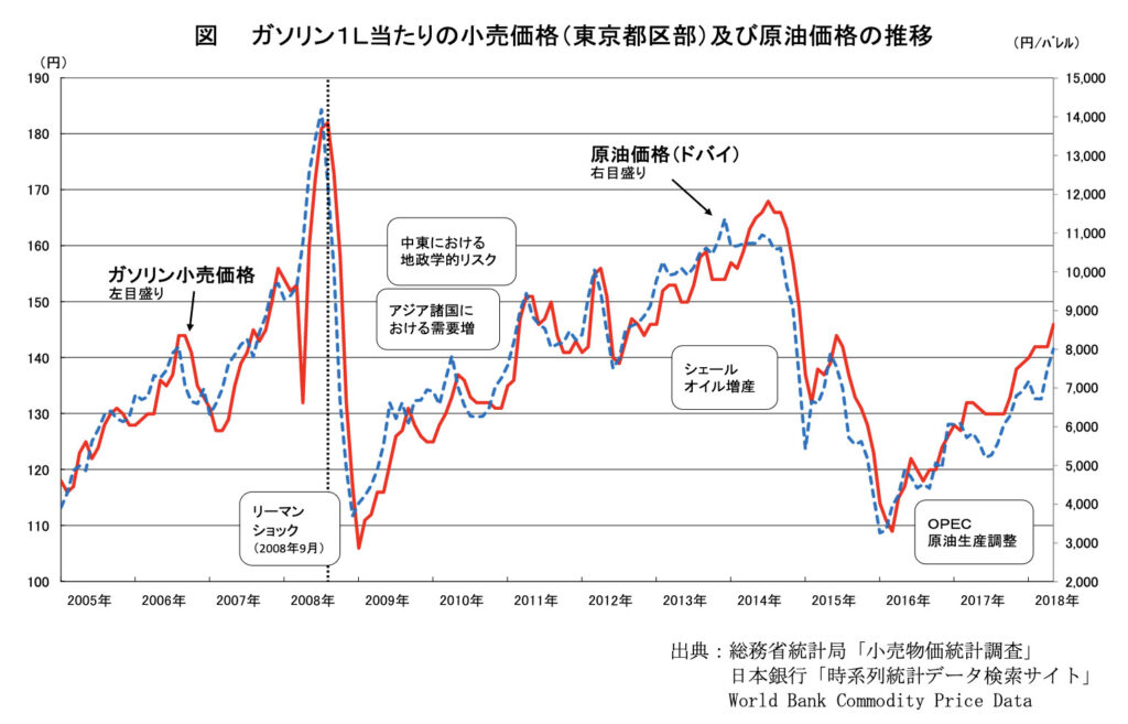 少し前の資料にはなりますが、ガソリン価格と原油価格の推移を表したグラフを掲載しますので、確認してください。