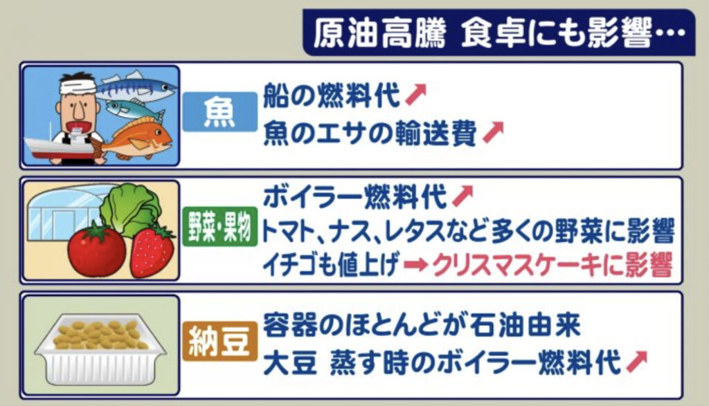 また、原油価格が上昇すれば軽油や灯油も上がりますから、農業に関するコストが上昇し、野菜などの食品価格も上昇していきます。