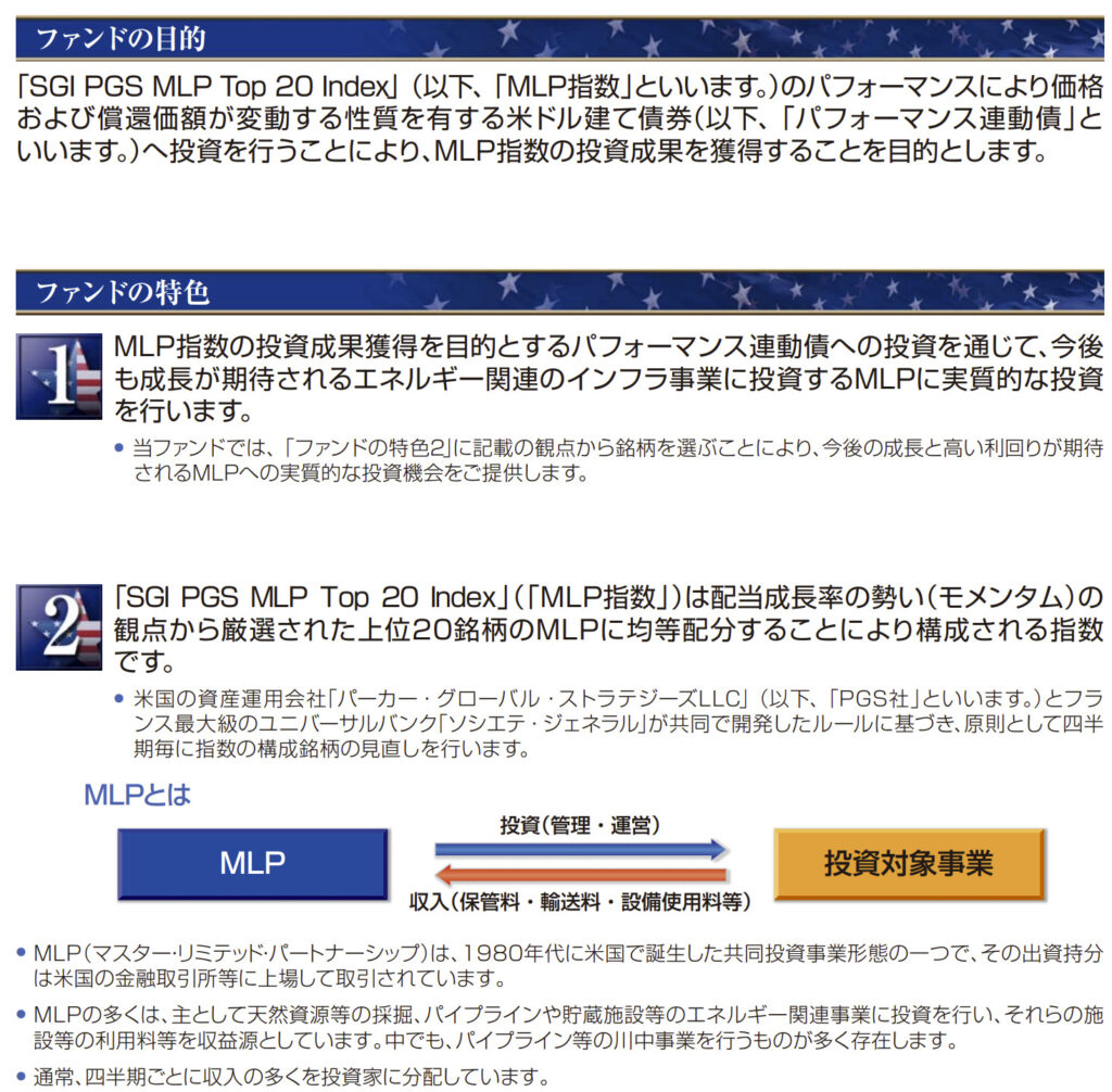 対象インデックス、SGI PGS MLP Top20 Indexに連動する米ドル建てパフォーマンス連動債に投資します。MLPとは共同投資事業形態のひとつであり、米国金融商品取引所に上場されているものです。