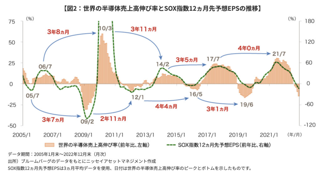 下図を見ていただきたいのですが、世界の半導体売上高伸び率のピーク及びボトムが約3~4年毎に訪れていることが確認できるかと思います。