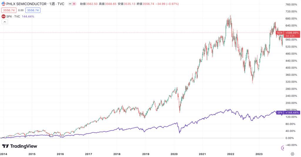 株価もS&P500指数と比較してみると、この10年でS&P500指数は+144.44%となっているのに対して、SOX指数は+599.99%と約4.15倍成長しておりますね。