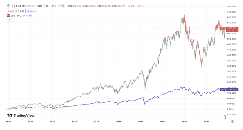 こちらの記事でも半導体市場の成長は加速していく旨を述べましたし、株価もSOX指数(フィラデルフィア半導体株価指数)は、この10年でS&P500指数の約4.15倍に成長していましたね。