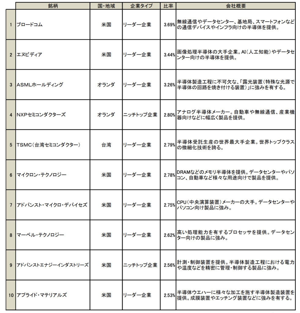 ちなみに、組入上位10銘柄には日本の企業は入っておりませんが、HOYAや東京エレクトロン、ディスコなどの日本企業が組入られております。