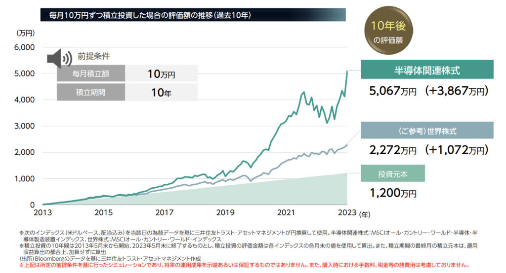 このファンドの商品資料でも、もし半導体関連株式に投資していれば、この10年で資産は約4.22倍に増えており、世界株式で運用しているのに対して4倍近く資産を増やすことができておりました。