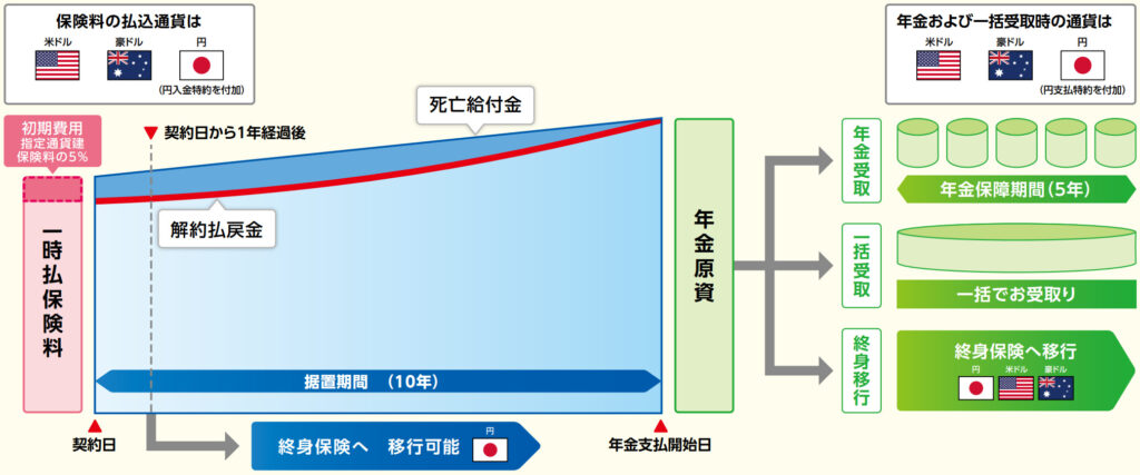 外貨建(米ドル or 豪ドル)の一時払個人年金保険です。契約時の予定利率で10年間運用され、満期を迎えると3パターンの選択肢があります。1つ目は5年確定年金、2つ目は一括受取、3つ目は終身保険へ移行です。10年以内の解約でも解約控除手数料は掛かりませんが、契約時に一時払保険料に対して5%の費用が引かれているからです。またこの保険は支払った保険料に上乗せされる死亡保険金はありません。なので健康状態に関係なく誰でも加入できます。