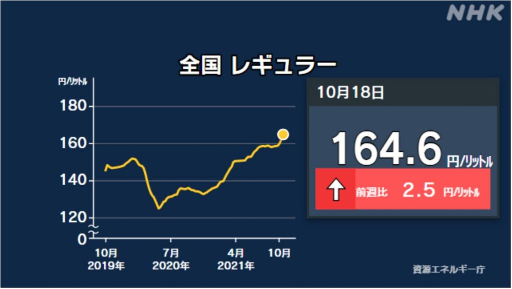しかも、最近は原油高騰も続き、1バレル83ドルを突破。約7年ぶりの高値まで上昇してきており、今週のレギュラーガソリンの小売価格も、全国平均で1リットルあたり164.6円となり、7週間連続で上昇しております。