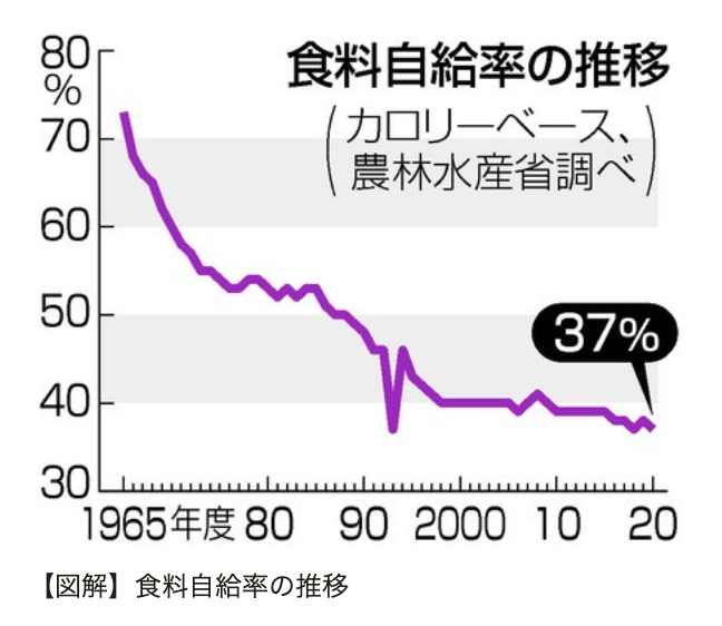 以前のブログでも食料自給率について取り上げましたが、2020年度の食料自給率(カロリーベース)を見ると、前年度から1ポイント低下し、37.17%で過去最低を更新しております。