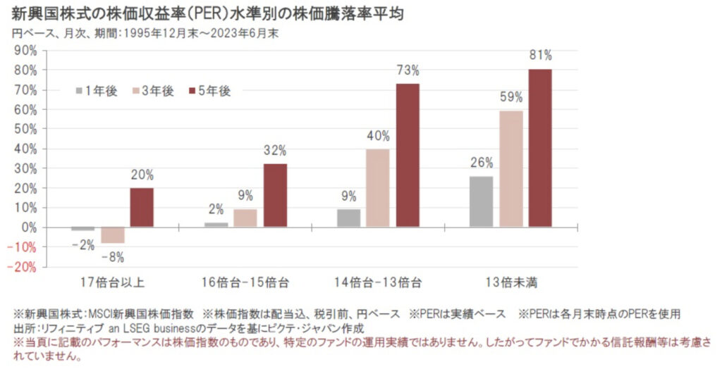 ピクテの資料において新興国株のPERの水準別にその後の株価騰落率をみると、PERの水準が低いほど、その後の株価上昇率が高くなっています。