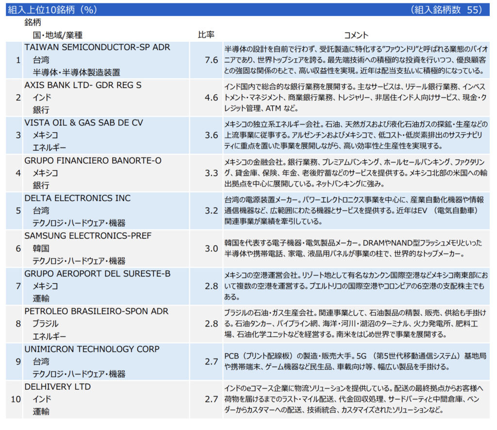 ・新興国株指数のウエイトに縛られず、確信度が高い銘柄に集中投資