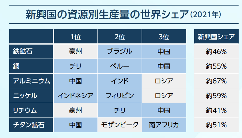 先進国は貴金属のような有価物に裏付けされていない紙幣をどんどん印刷して大変なことになってきておりますが、新興国の多くは有価物である資源を有しておりますから、今後も資源を活用した経済成長が期待できますね。