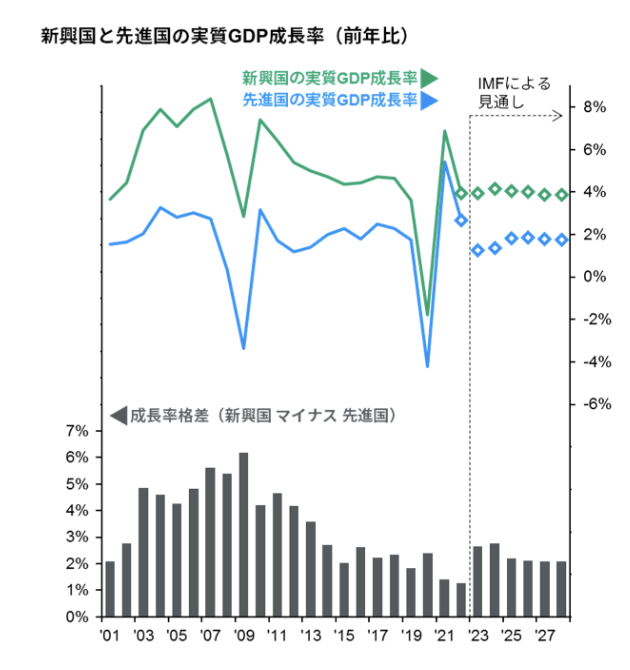 また、IMF(国際通貨基金)の資料によれば、新興国と先進国の実質GDP成長率(前年比)は新興国の方が高いですし、新興国と先進国の成長率格差も緩やかに拡大していくと考えられております。