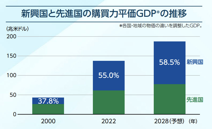 物価の違いを調整した購買力平価GDPでも新興国と先進国の差は拡がっていき、2028年には新興国が6割近く占めるようになっていくようです。