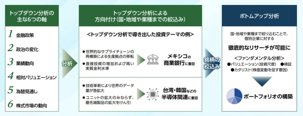 このファンドは、この「トップダウンアプローチ」と「ボトムアップアプローチ」を融合して効率的な運用を目指しているようです。