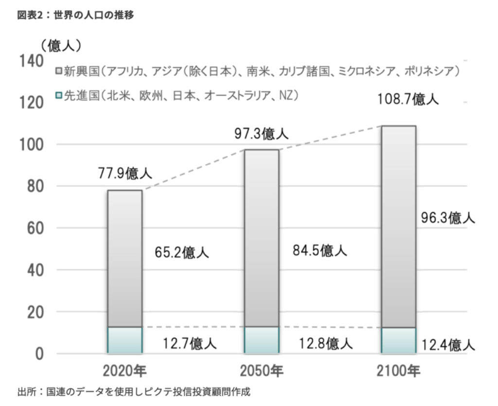 経済成長の源泉となる人口は、先進国は今後2100年までほとんど変わりませんが、
