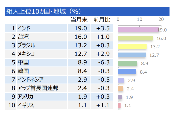 一般的に新興国株指数は中国、台湾、インド、韓国の4ヵ国・地域に偏った構成比率となっておりますが、このファンドは、局面ごとの投資環境を踏まえて機動的に配分比率を変更します。
