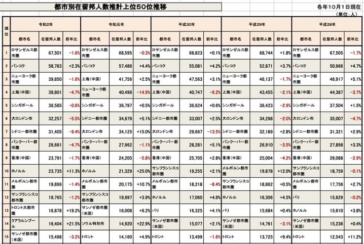 とは言いながらも、全世界で在留邦人数が均等に減少しているのかというとそうでもなく、都市毎に見てみると、バンコクやホノルル、そしてトロントやクアラルンプール(KL)といった場所では増加しています。特にバンコクは単年における増加率ではホノルル、トロント、KLに見劣りしますが、そもそも分母となる邦人の総人口が大きく、しかも長年に渡って安定的に増えています。世界最大の邦人数を抱えるロサンゼルス(LA)が緩やかな減少傾向にありますから、もしかしたら数年後にはバンコクがLAを追い抜いて1位になるかも知れませんね。