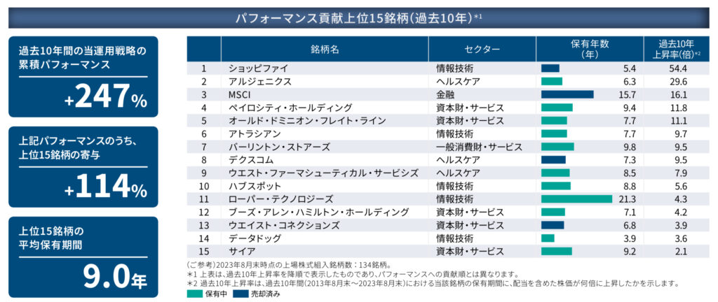 これまで同ファンドのパフォーマンスに寄与してきた上位15銘柄です。過去10年で54倍とかすごいですよね。全体として、過去10年で+247%のリターン、平均的に9年保有していくそうです。初期段階だけとはいえ、この短さ(それだけ速く成長できる米国市場)はすごいとしか言えません。